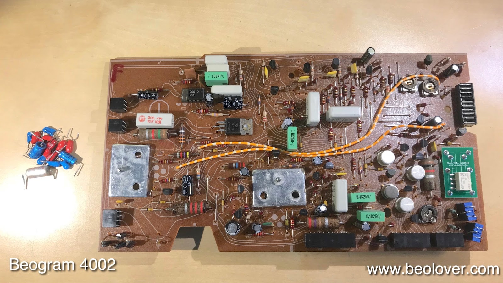 After restoring the basic functionality of the Beogram 4002 (5513) that I am restoring right now, it was time to complete the restoration of the main PCB and install a trimmer to properly bias TR3, which is responsible for the amplification of the record detection sensor signal. This shows the board as I received it: