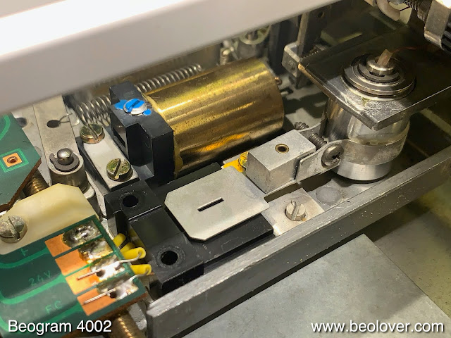 Another item that should be replaced in any Beogram 4002 (5503) restoration is the transistor (TR9) that amplifies the record detection sensor signal. It is a high-gain type that is often out of spec these days. I usually replace it with a 2N5089. In order to be able adjusting its collector voltage to 4V as specced in the service manual, R33 that pulls up the base needs to be replaced with a trimmer. I usually instal a 25-turn 5MOhm type, which allows the precise biasing of the transistor:
