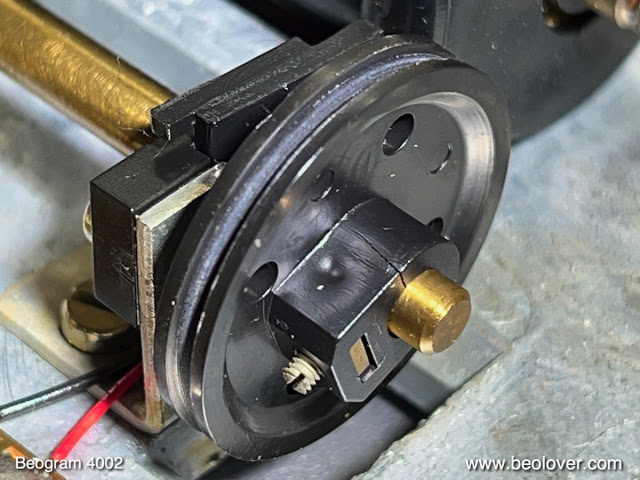 In practically all Beograms that I have encountered so far there is a hairline crack in the shaft collar that makes it impossible to fix the pulley to the shaft properly. I replaced it with a nice precision machined aluminum replica: